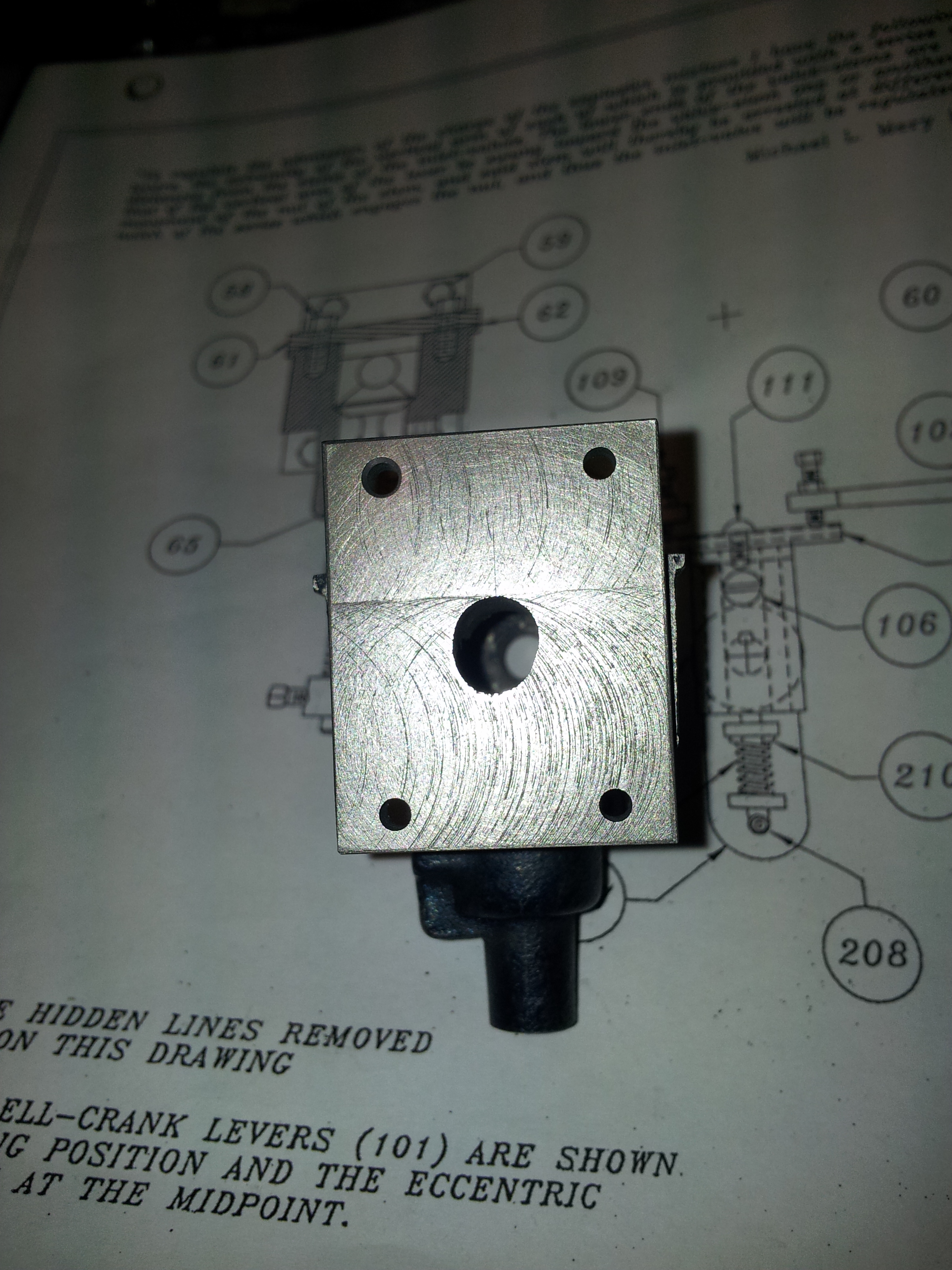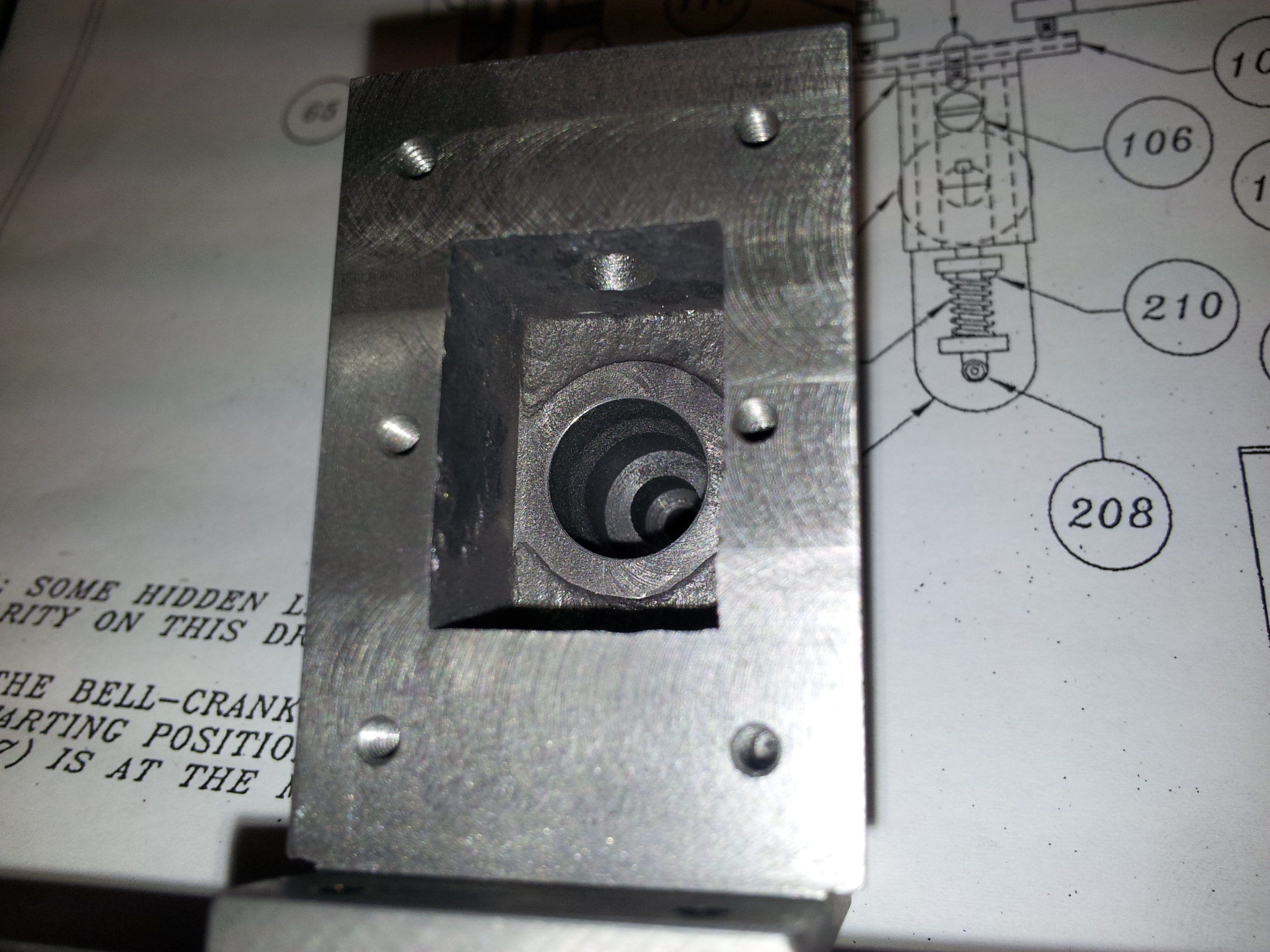 When you drill the intake hole on the flange face, pay attention! The inside is step. If you try to use a 1/4 drill, it will walk once it hits the inside step, been there. First find the hole, then center drill it. Use a small drill like 1/8 to drill a pilot through. Next use a 1/4 end mill to cut the rest. Even if you use a 2 flute end mill, you should pilot it so you don't get any walk. You can go all the way into the chamber with the mill since you want as much hole as you can get.